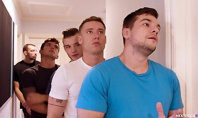 Tugging gay group cumming on blonde pal
