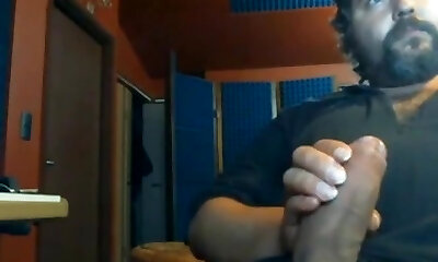 Huge hairy bear jerking a big cock in the talk