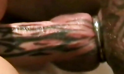 Peeing with pierced shaft chain and lock attached while wearing heels